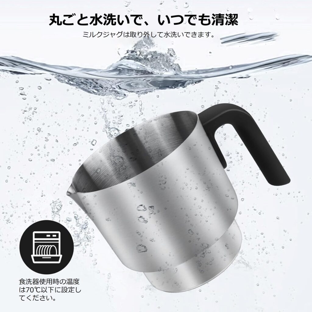 ミルクジャグは本体から取り外して丸ごと水洗いでき、いつでも清潔にお使いいただけます。食洗機にも対応しています。