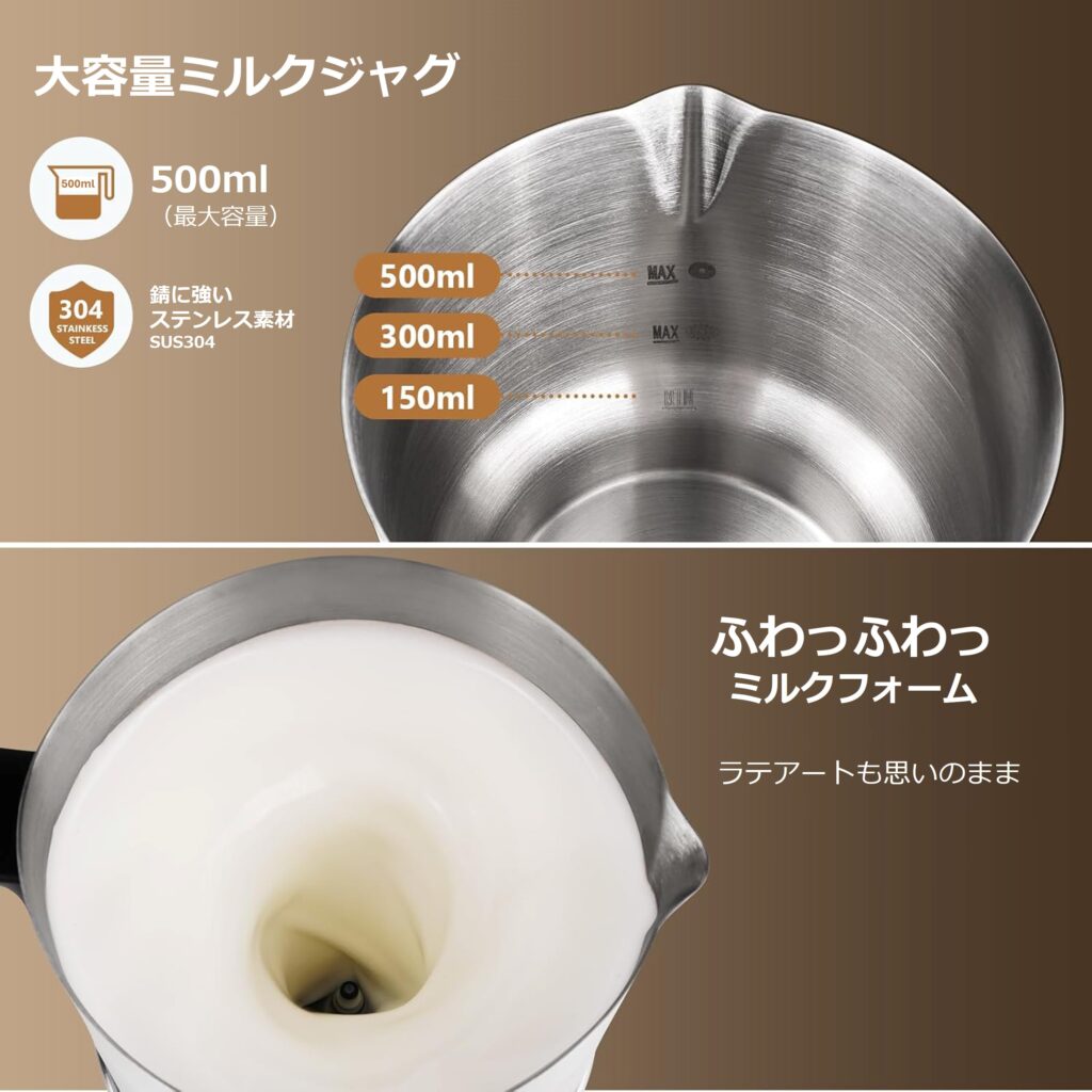 ホットミルクは最大500ml、フォームミルクは最大300mlまでたっぷり作れます。